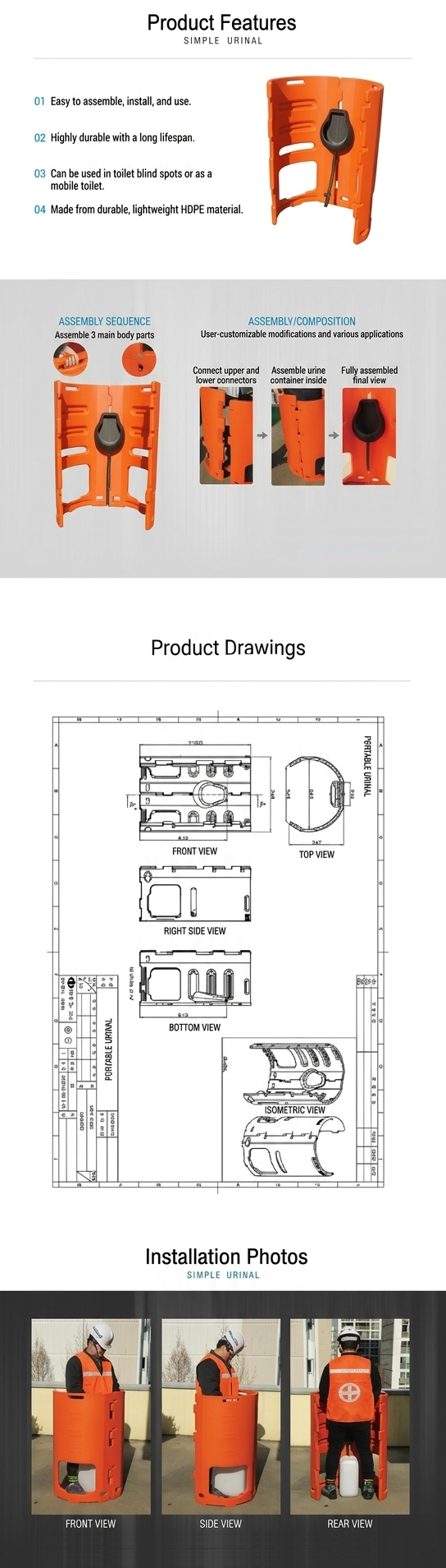 Share Portable Urinal Product Description Product Inquiry Partnership Inquiry Product SpecificationsProduct NamePortable UrinalMaterialHDPESpecificationL744 x W541 x H1,100mm Detailed Description